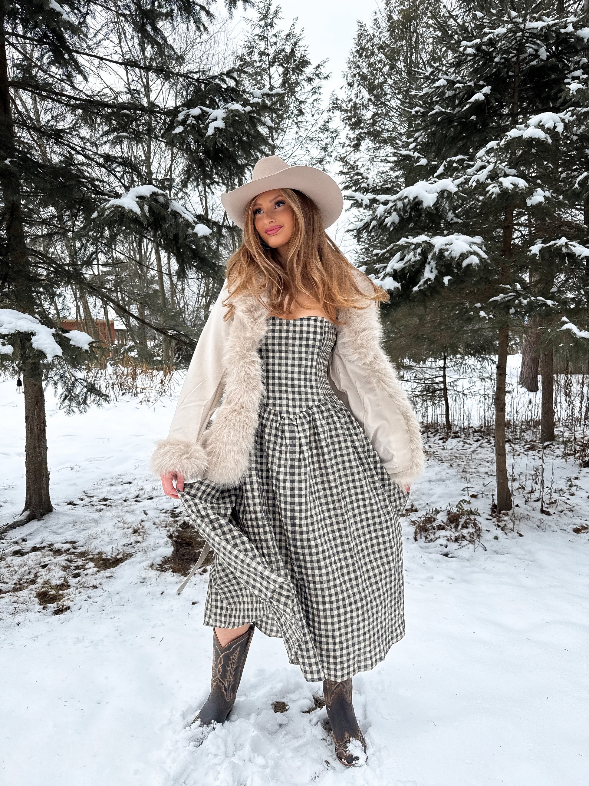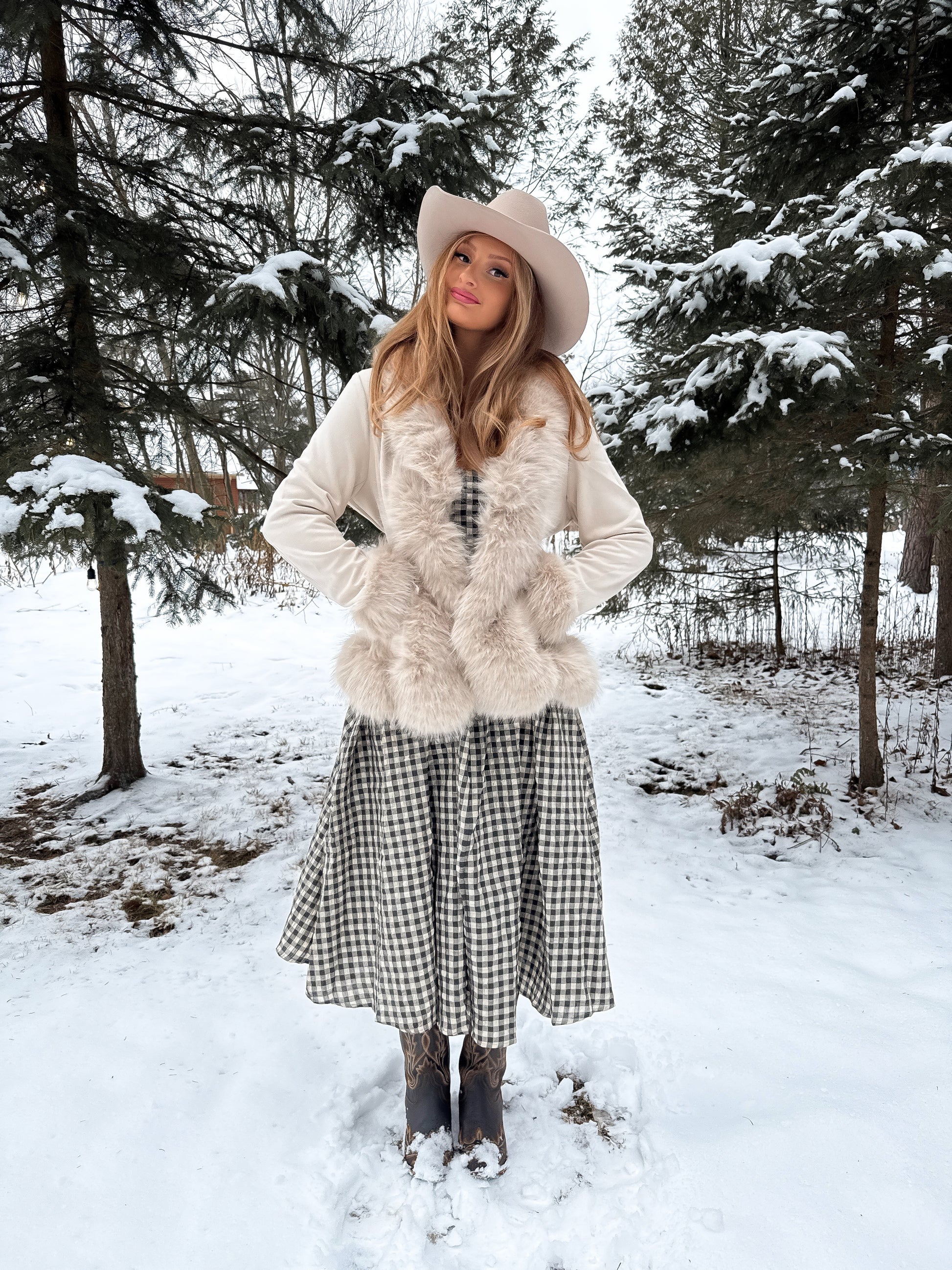 • Features: Oversized faux-fur collar, matching fur cuffs, tie-waist belt, long sleeves, midi-length hem, structured tailoring