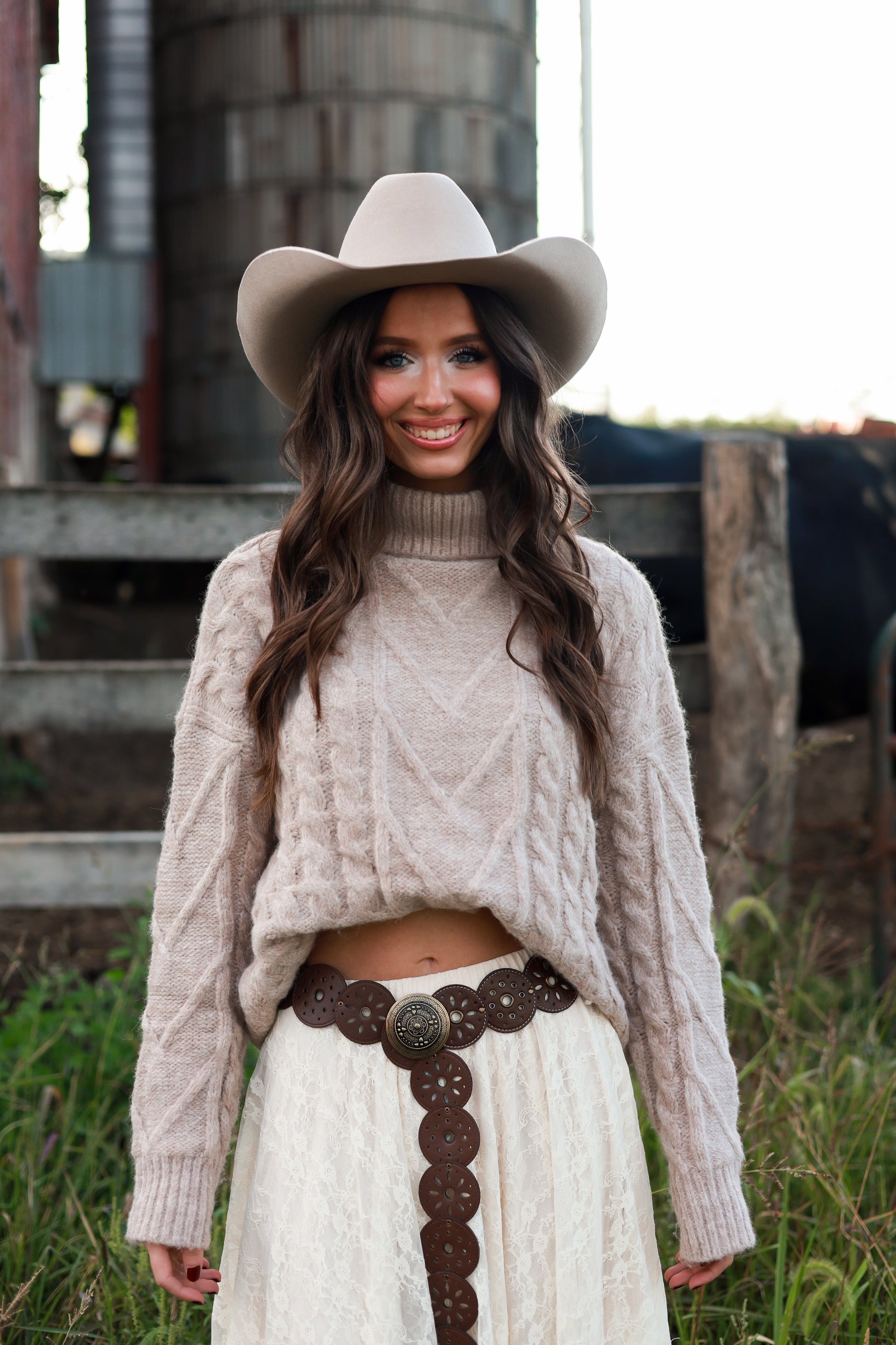 Why You'll Love It: Timeless with a twist, this cable knit sweater brings together classic comfort and feminine charm. The warm turtleneck design keeps you snug on chilly days, while the scalloped hem adds a soft, romantic touch. Intricate knit textures offer rich visual detail, making it an easy standout—whether styled with denim, wide-leg trousers, or layered over a flowy skirt.