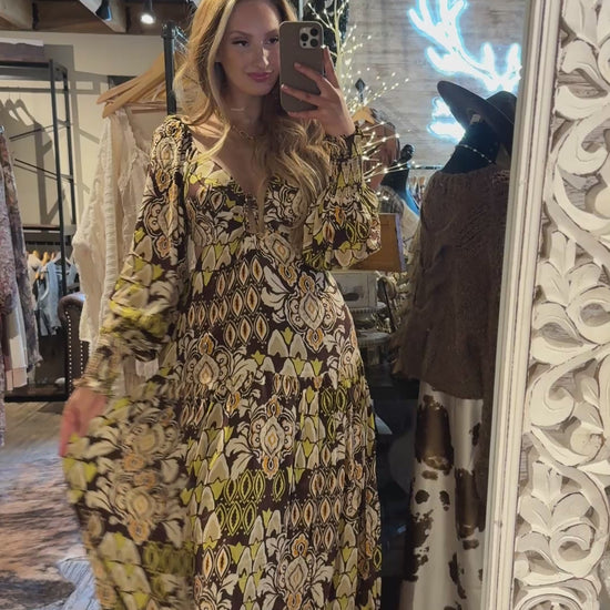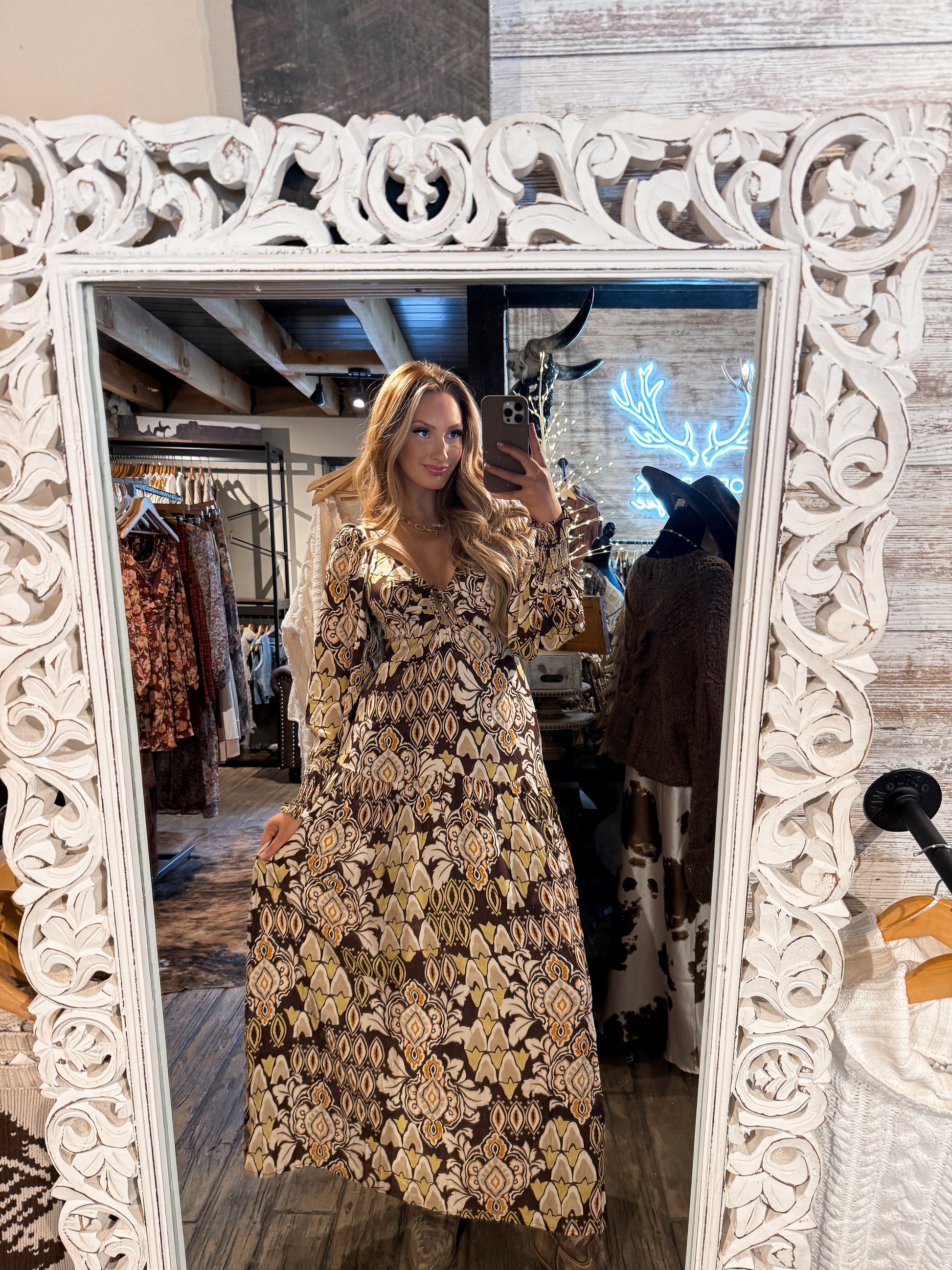 Effortlessly romantic, this Stone Ember Keyhole Long Sleeve Maxi Dress is perfect for weekend picnics, country fairs, or evening strolls through the countryside. Pair it with ankle boots and a wide-brim hat for a relaxed western vibe, or style it with strappy sandals and delicate jewelry for a boho-chic evening look.