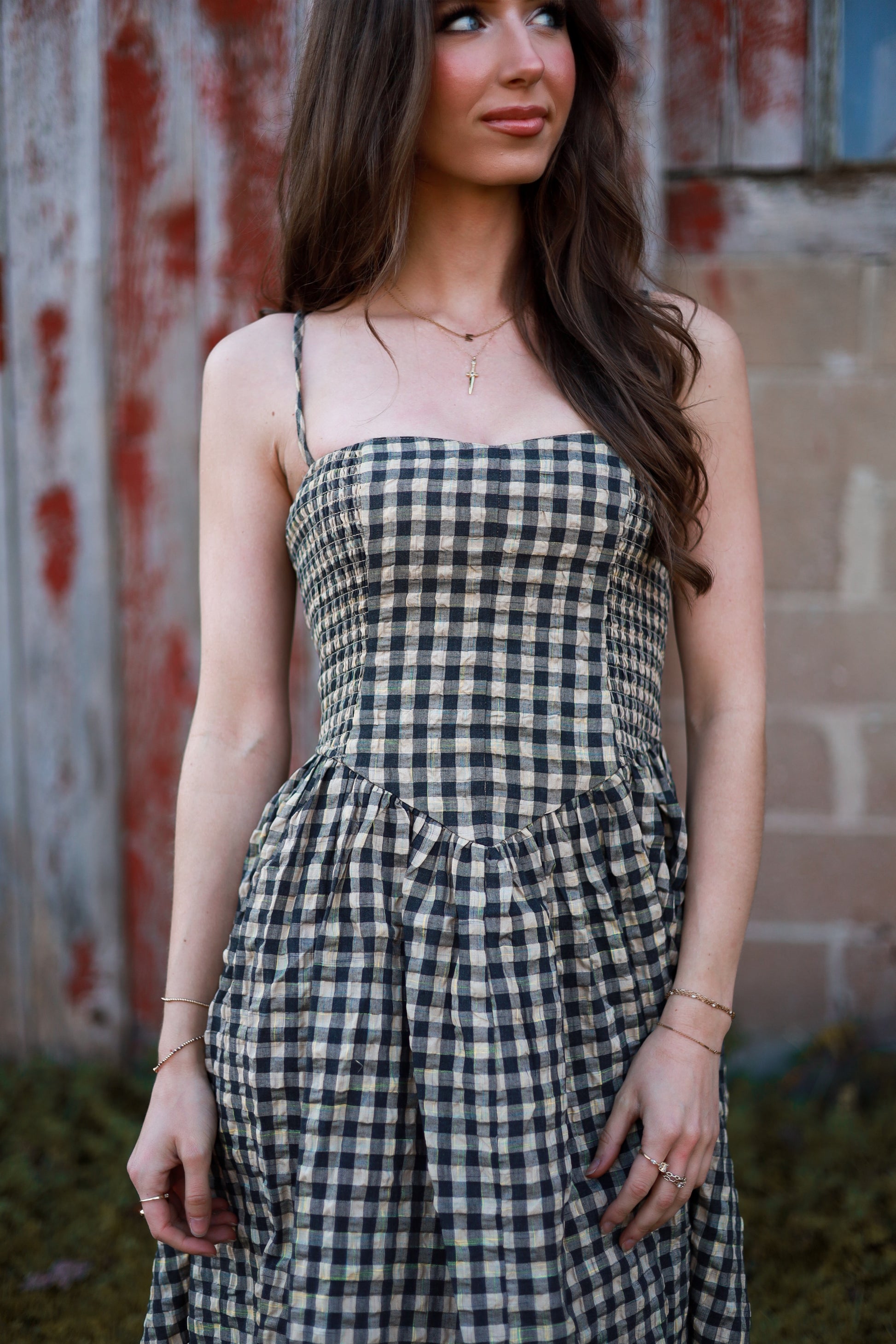 This dress captures effortless femininity with a touch of heritage charm. The structured bodice creates a flattering, tailored fit, while the flowy skirt moves beautifully with every step. The gingham print brings a classic nod to vintage western style — simple, refined, and endlessly wearable.