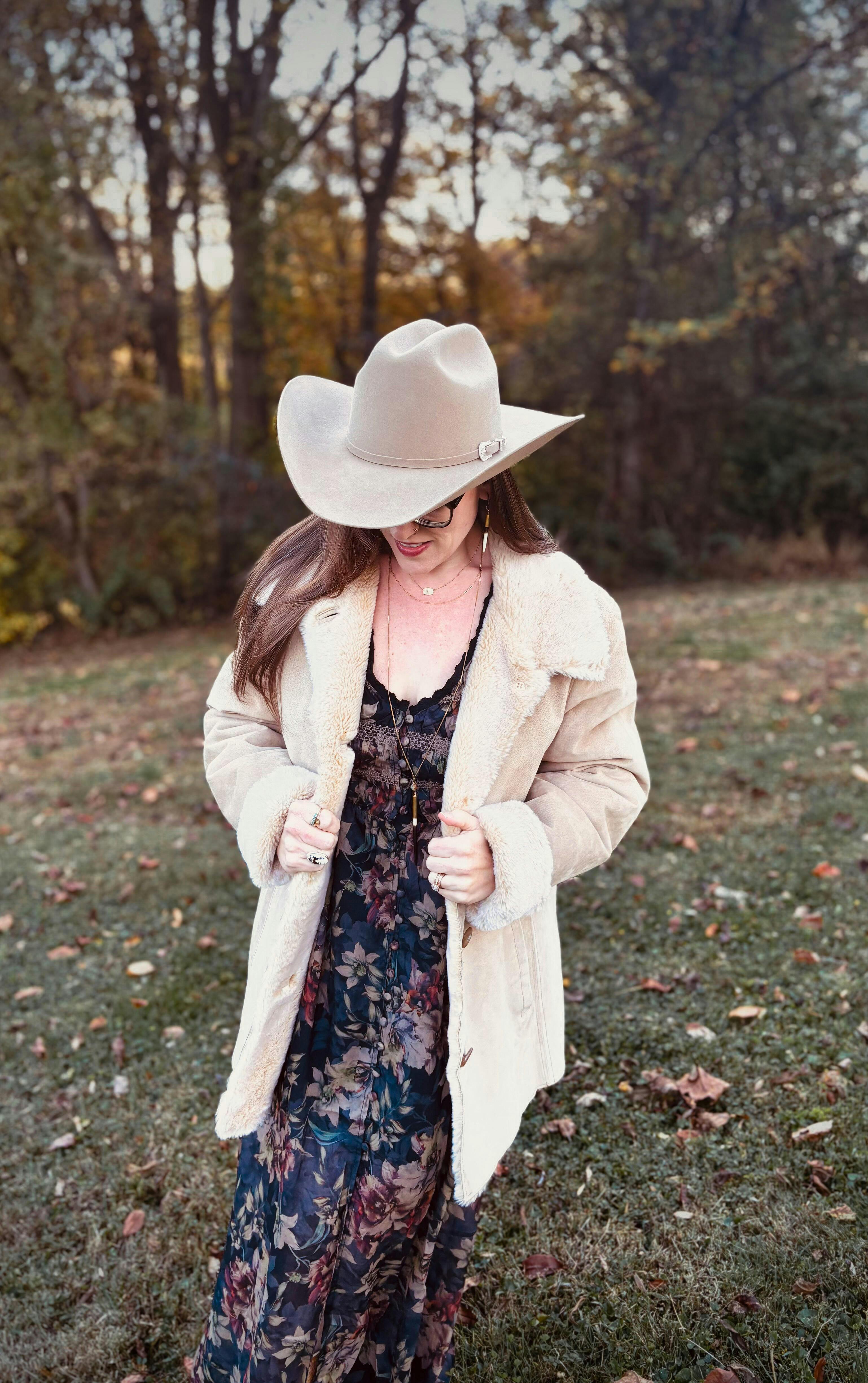 This dress brings a moody, western edge to your fall lineup. Perfect for barn weddings, date nights, or country concerts, the bold dark florals and flowy bell sleeves make a statement wherever you wear it. Pair with boots and a hat for that effortless boho western look.