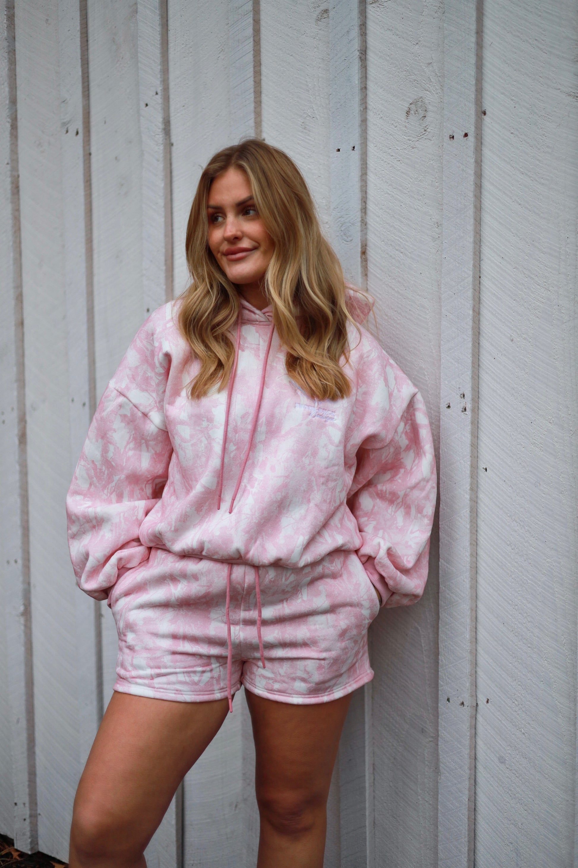 Pink and white camo hoodie with white logo embroidery. Size up 1 size for oversized look.