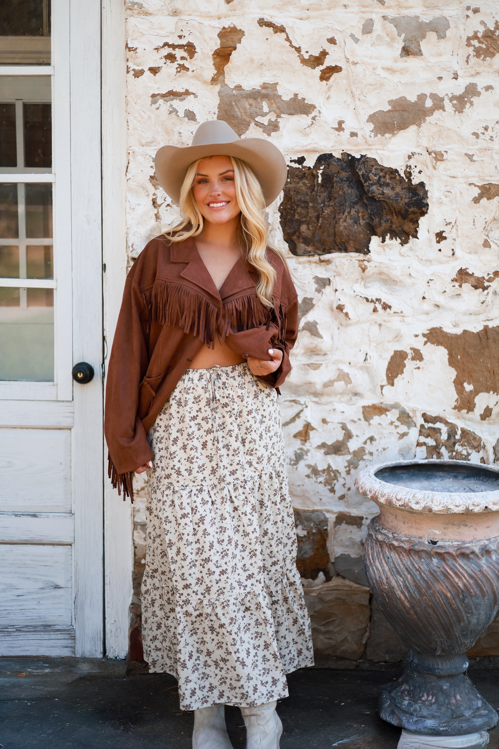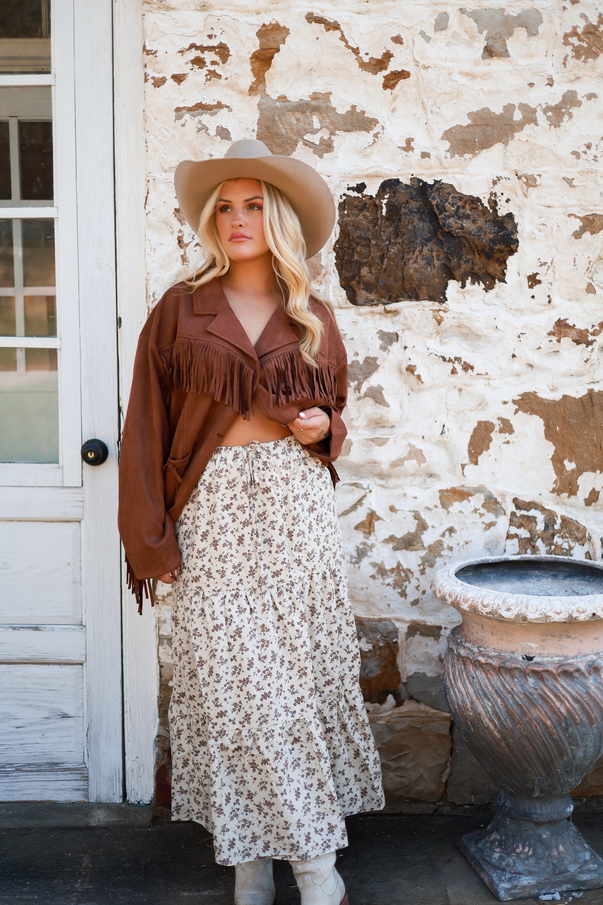 Crafted from soft chestnut suede, this slightly oversized jacket combines rustic charm with modern ease. Fringe detailing adds movement and personality, while front pockets with delicate bow accents bring subtle femininity. Its relaxed fit and luxe texture make it a piece you’ll reach for season after season.
