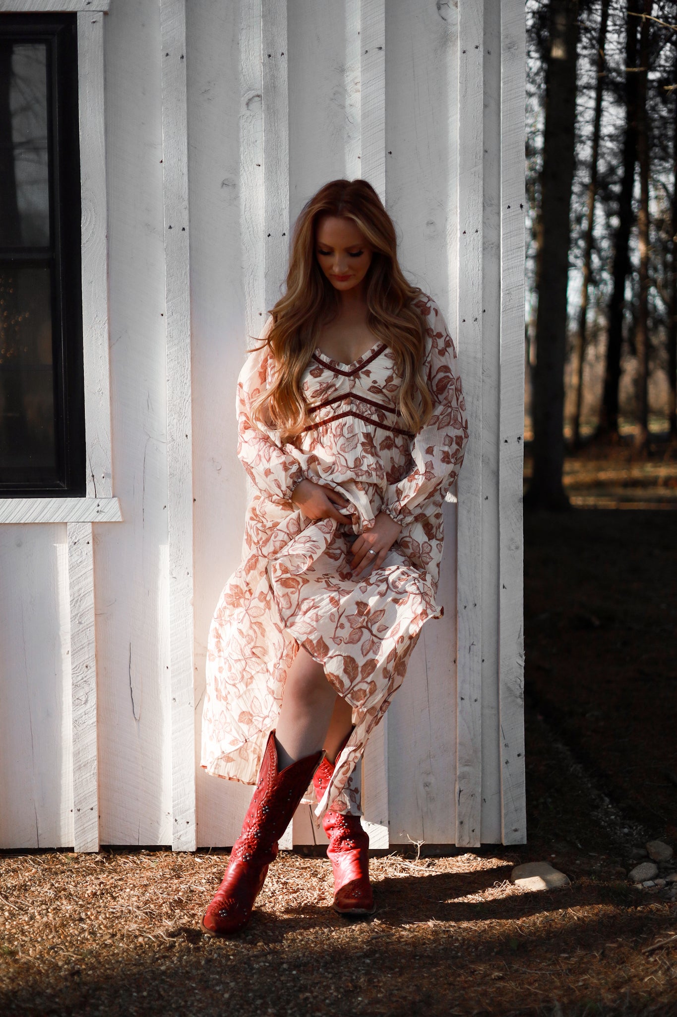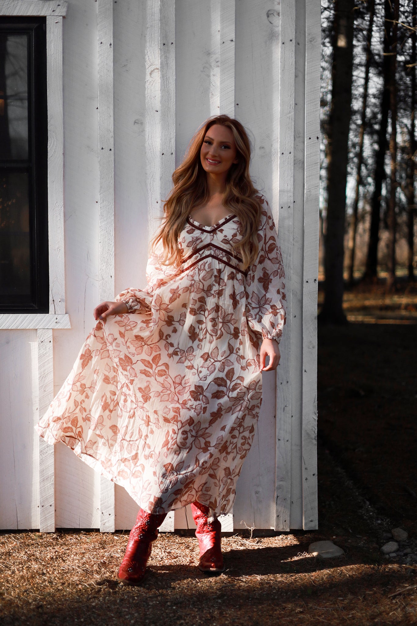 The Willow Vale Maxi is made for sunlit afternoons and countryside gatherings — from vineyard luncheons to fireside dinners and weekend escapes. Pair it with heeled boots, a felt hat, or dainty gold accents for an effortlessly romantic Western-cottage look.